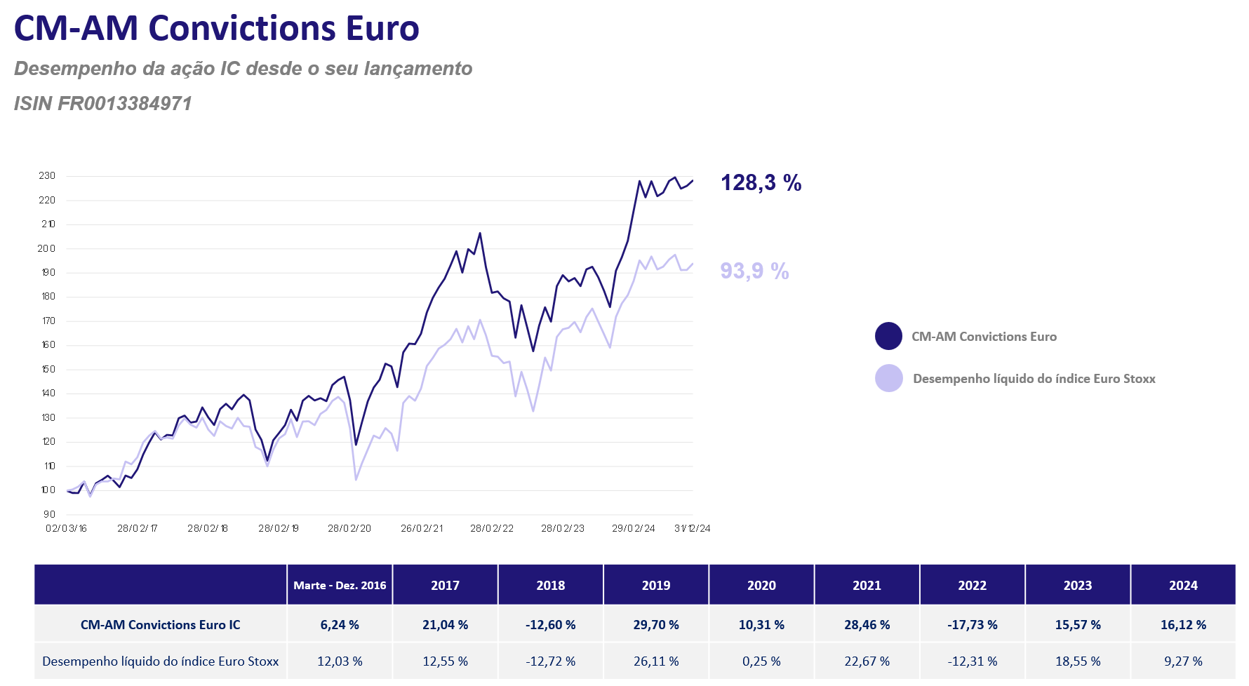 O desempenho passado não é garantia de desempenho futuro. O índice EURO STOXX ® Net Return é expresso no fecho, os dividendos são reinvestidos. Desempenho líquido das taxas de administração.