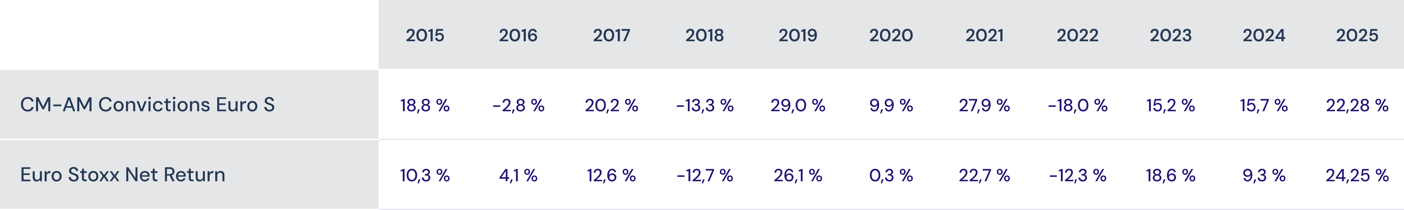 Principales riesgos de CM-AM Convictions Euro: riesgo de pérdida de capital, riesgo de mercado de acciones, riesgo de gestión discrecional, riesgo de liquidez, acciones de pequeña capitalización, riesgo de sostenibilidad. La información completa sobre riesgos está disponible en el Prospecto de cada fondo. Rentabilidades pasadas no son indicativas de resultados futuros. La información anterior no constituye una oferta ni una solicitud para invertir.