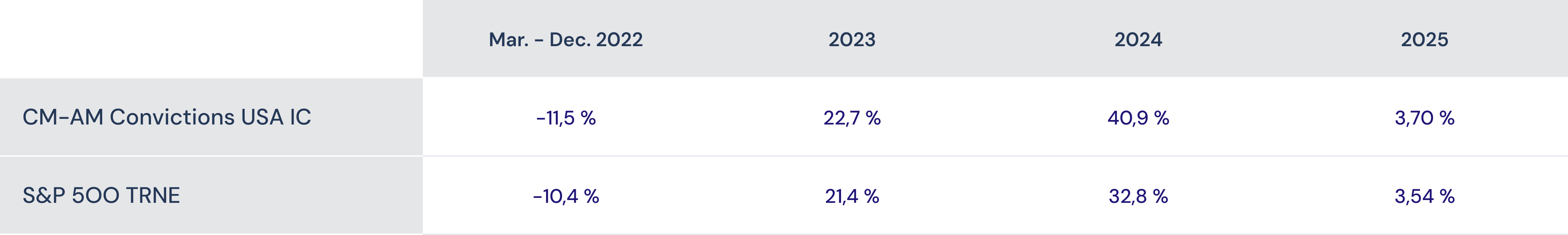 Principales riesgos de CM-AM Convictions USA: riesgo de pérdida de capital, riesgo relacionado con la gestión discrecional, riesgo de renta variable, riesgo de contraparte. La información completa sobre los riesgos está disponible en el Prospecto de cada fondo. La información completa sobre riesgos está disponible en el Prospecto de cada fondo. Rentabilidades pasadas no son indicativas de resultados futuros. La información mencionada anteriormente no constituye una oferta ni una solicitud para invertir. El índice S&P 500 Net Return se expresa al cierre con los dividendos reinvertidos. La rentabilidad mostrada es neta de comisiones de gestión.