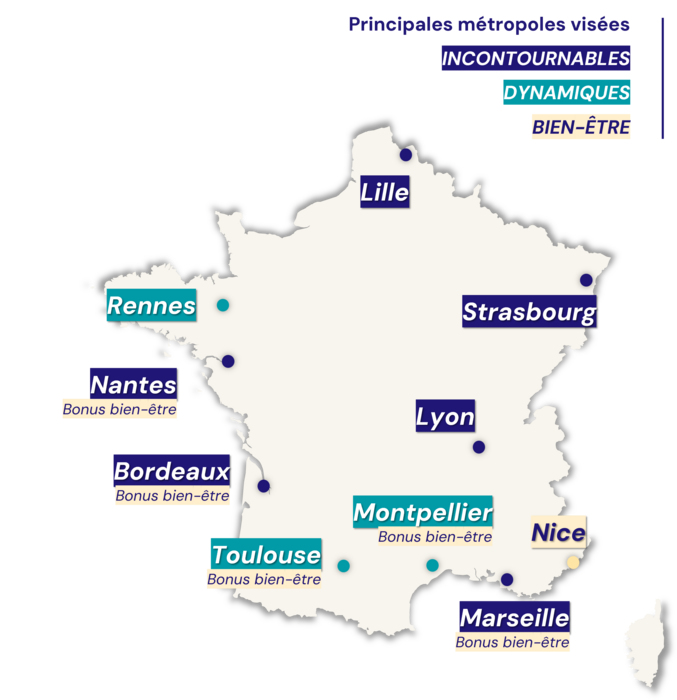 Principalement dans les grandes métropoles régionales au rayonnement national ou international dont Bordeaux, Lille, Lyon, Montpellier, Marseille, Nantes, Nice, Rennes, Strasbourg et Toulouse. Ce patrimoine immobilier pourra également comprendre des actifs sélectionnés en région Ile-de-France.
