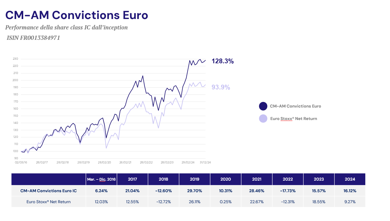 Principali rischi di CM-AM Convictions Euro : rischio di perdita del capitale, rischio azionario, rischio di gestione discrezionale, rischio di liquidità, azioni a piccola capitalizzazione e rischio di sostenibilità.