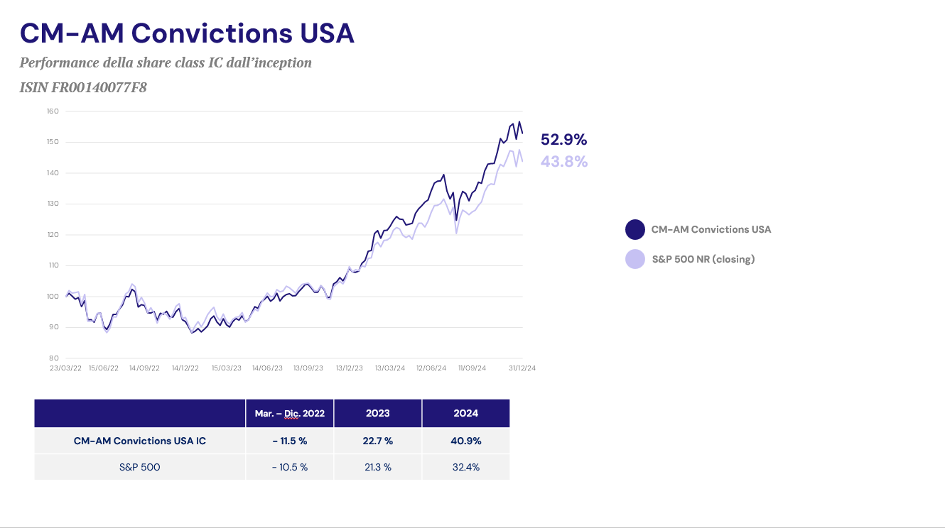 Principali rischi di CM-AM Convictions USA: rischio di perdita del capitale, rischio azionario, rischio di gestione discrezionale, rischio di liquidità, azioni a piccola capitalizzazione, rischio di sostenibilità.